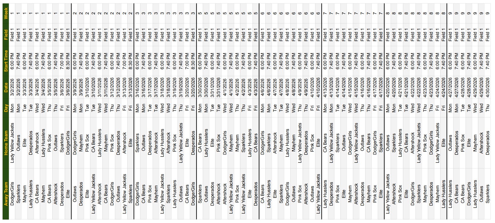 Game Schedule: Spring 2026 Schedule