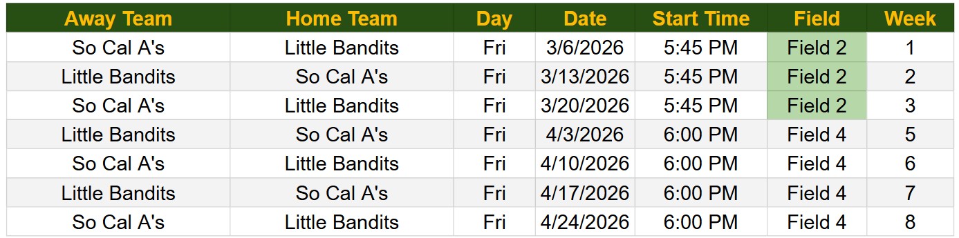Game Schedule: Spring 2026 Schedule